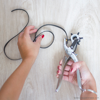 5/ Munissez vous de la poinçonneuse avec la dimension de perforation la plus petite, puis percez la lanière de cuir aux deux extrémités.