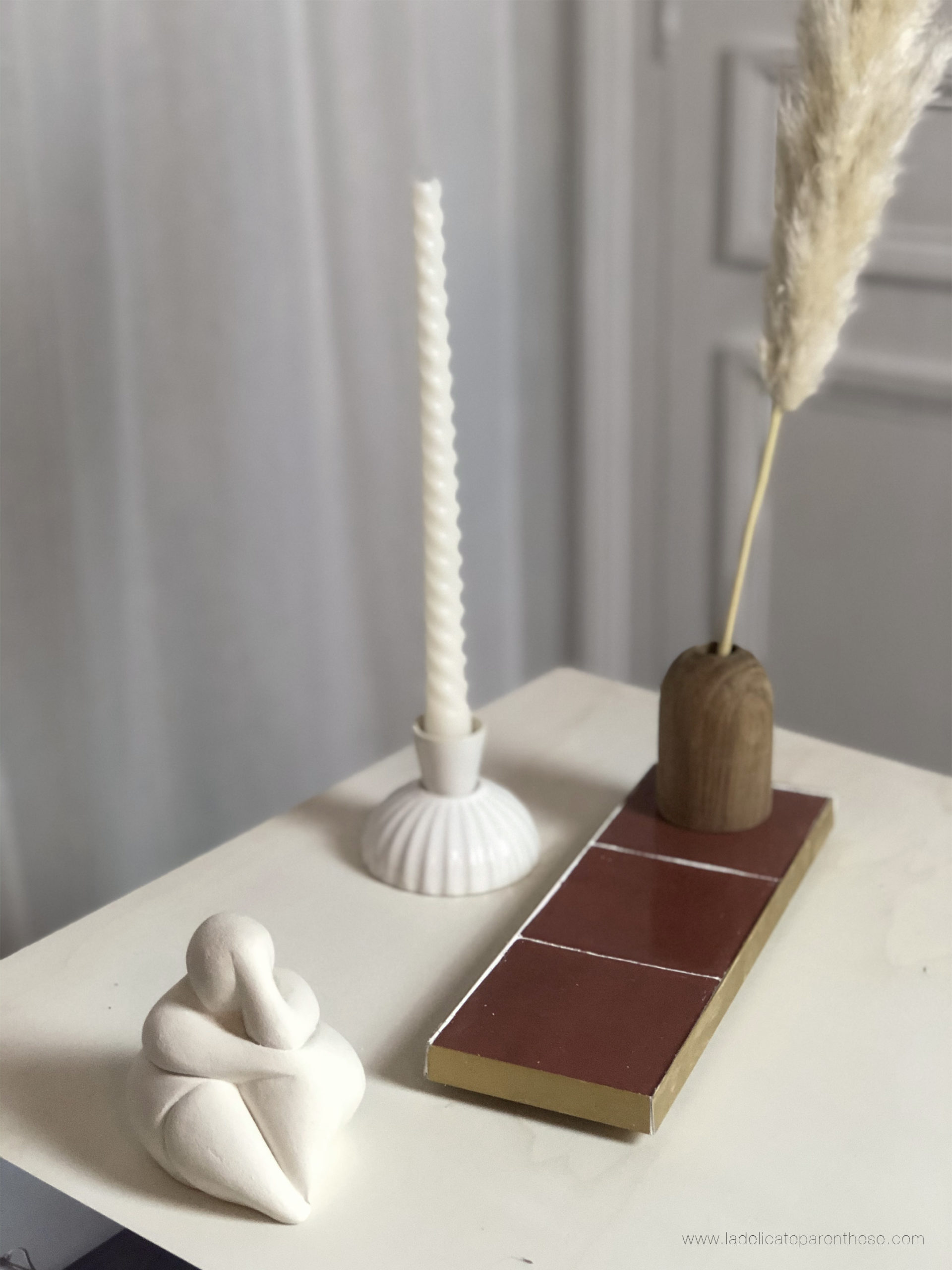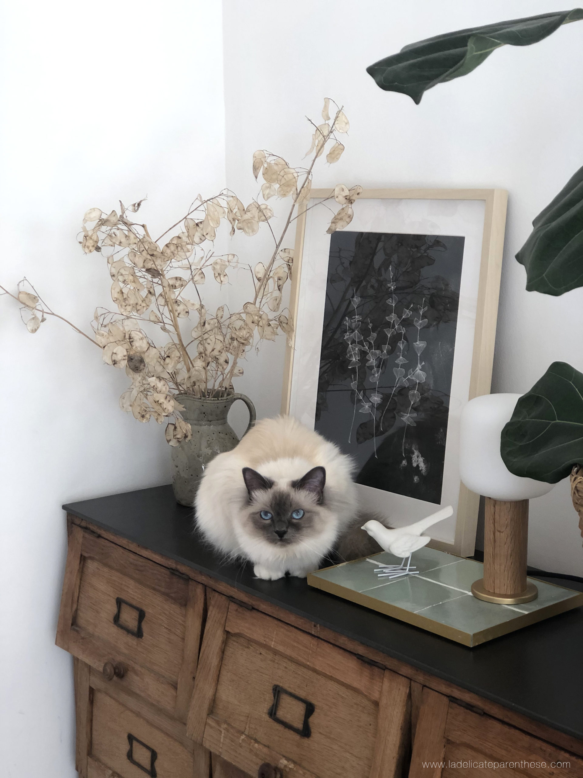 Et voici, il vous suffira tout simplement d’y poser délicatement une bougie, une paire de lunettes, une jolie statuette. Pour ma part Kalya à déjà élu domicile aux côtés de son nouvel ami, non pas la création en elle même, évidemment, mais bien le petit oiseau de porcelaine venant tout droit d’Amsterdam.