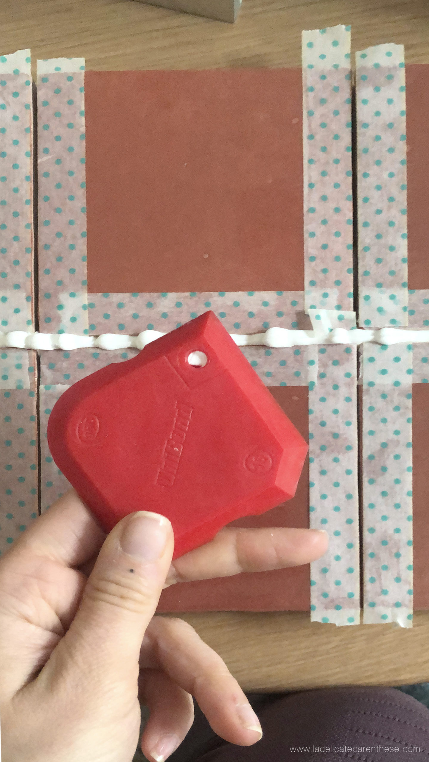 6/ Après séchage, intégrer délicatement le joint de salle de bain dans les écarts. Pour une finition optimale j’y intègre de part et d’autres su scotch re-positionable, permettant des joints parfaits, sans avoir à retirer le surplus à l’acetone.