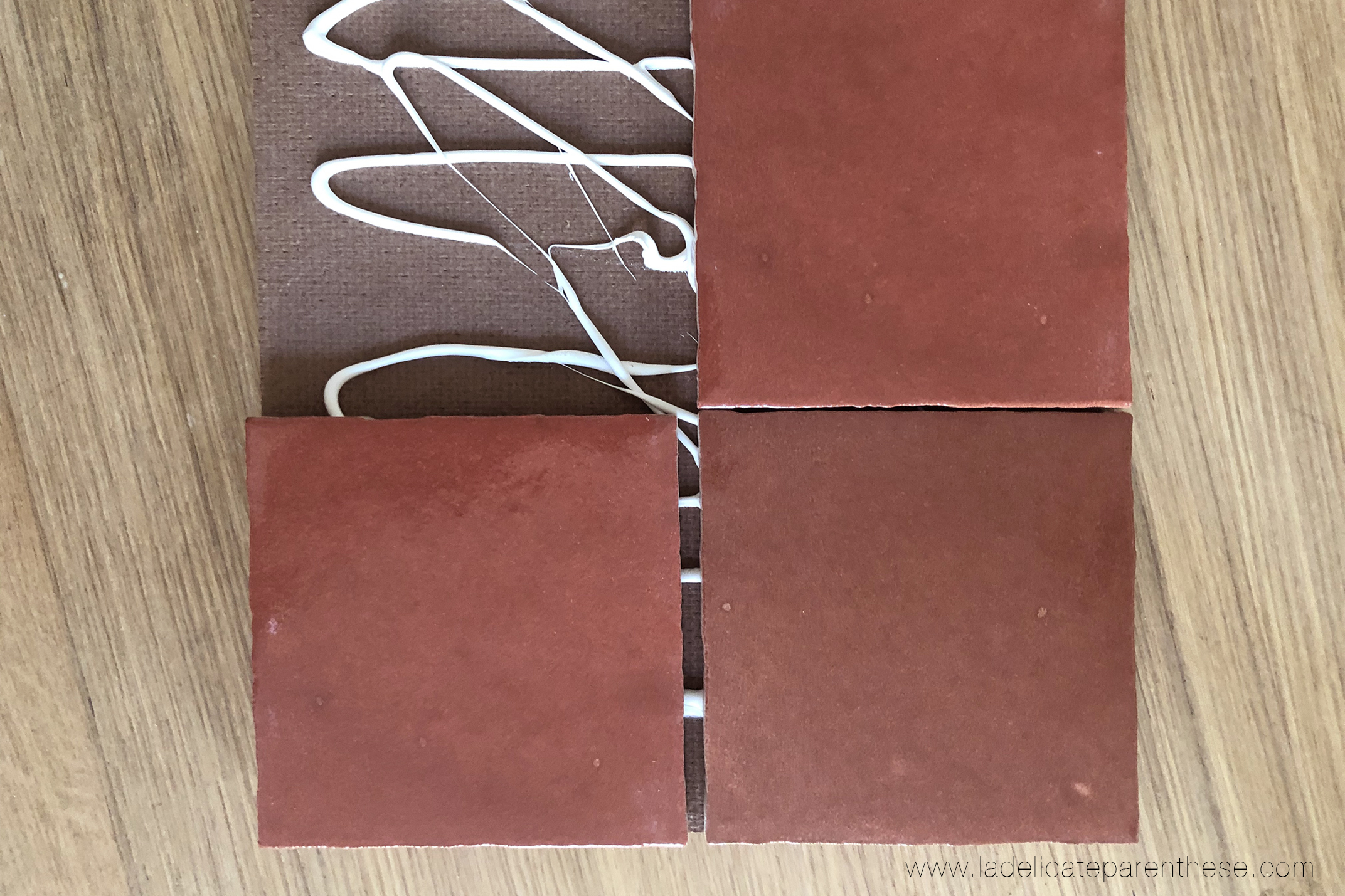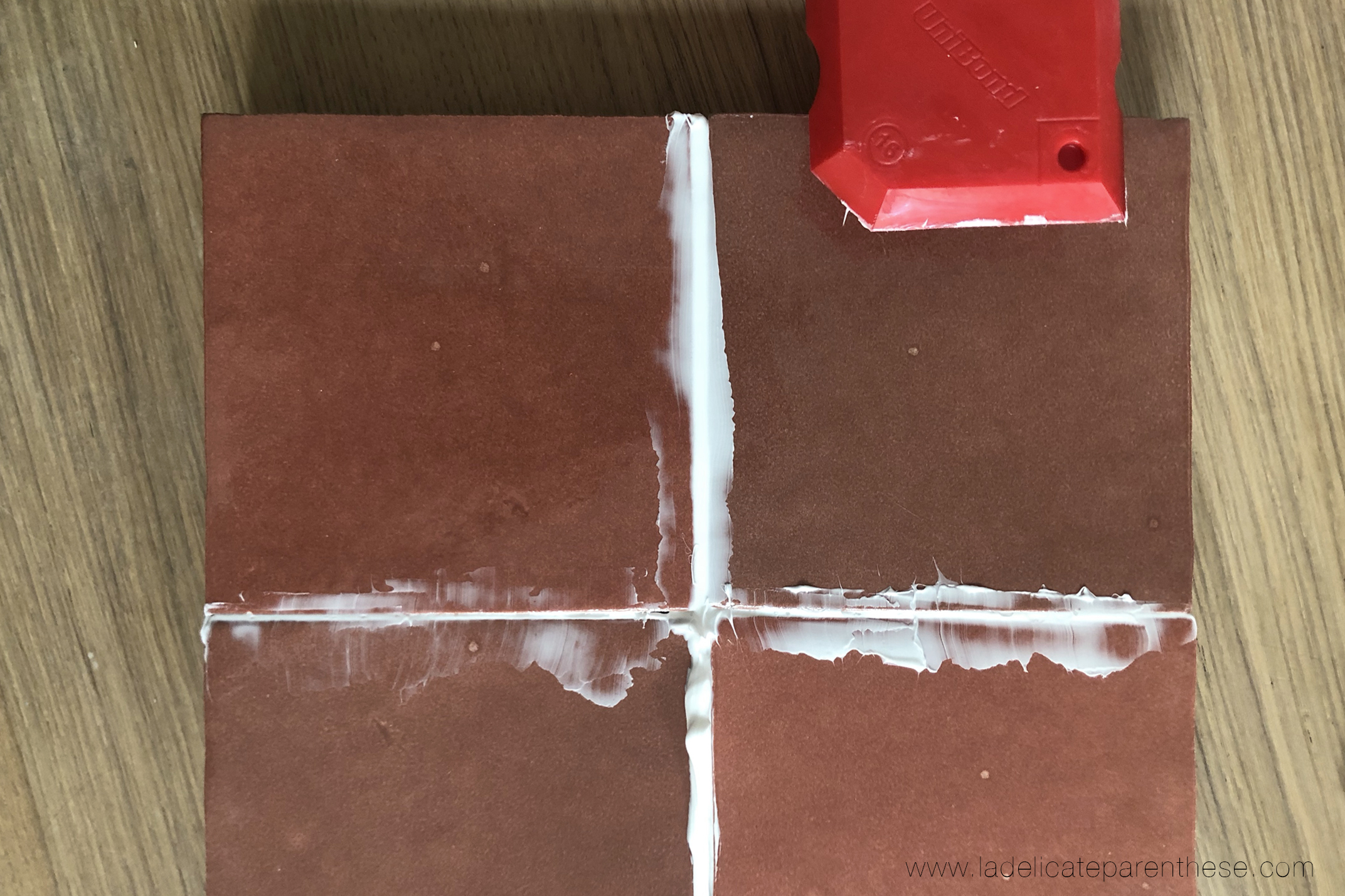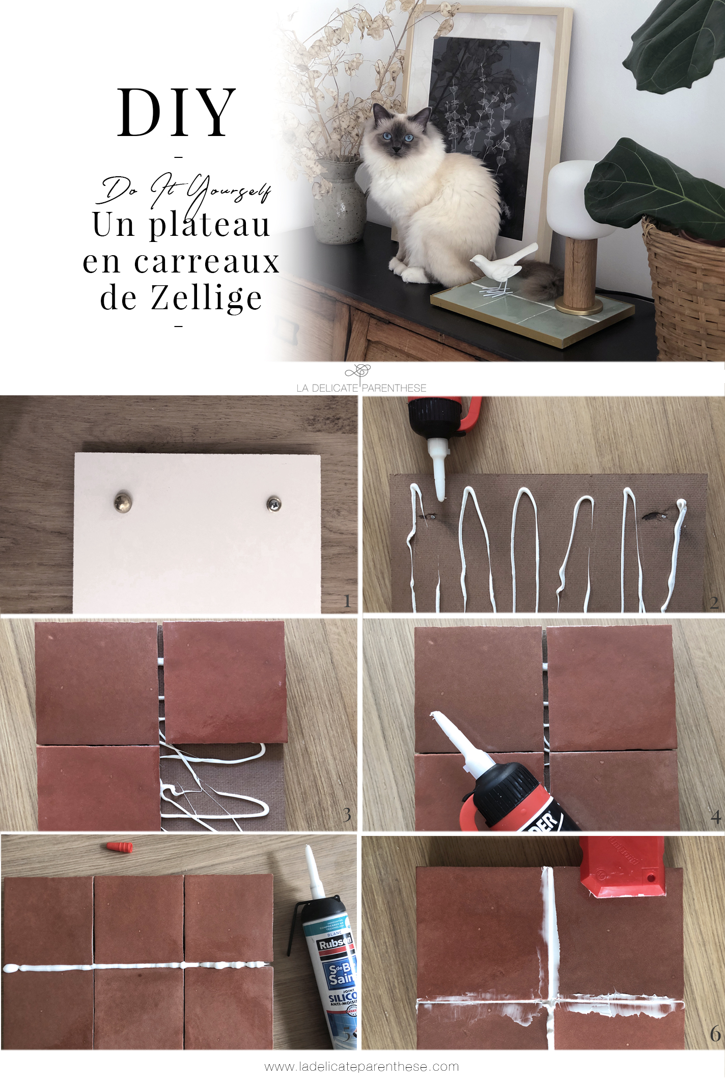 Pour ce qui est du silicone, pas de panique, si vous n’en possédez pas, n’hésitez pas à réaliser une plaque de support en bois plus petite, correspondant à la dimension exacte des carreaux de zelliges ( ou autres) ainsi cela ne sera pas nécessaire de les jointer, et vous obtiendrez ainsi un plateau plus ‘brut’ mais terriblement élégant.