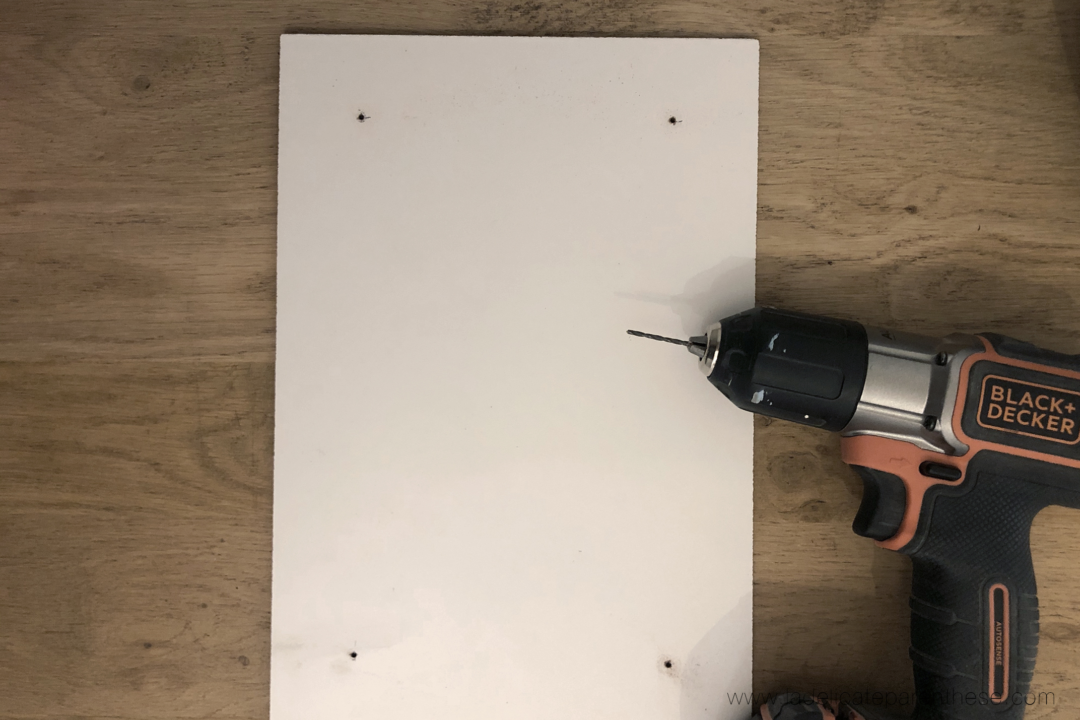 1/ Commencez par percer des trous à la mèche fine aux quatre coins du plateau sur les futurs emplacements des pieds.