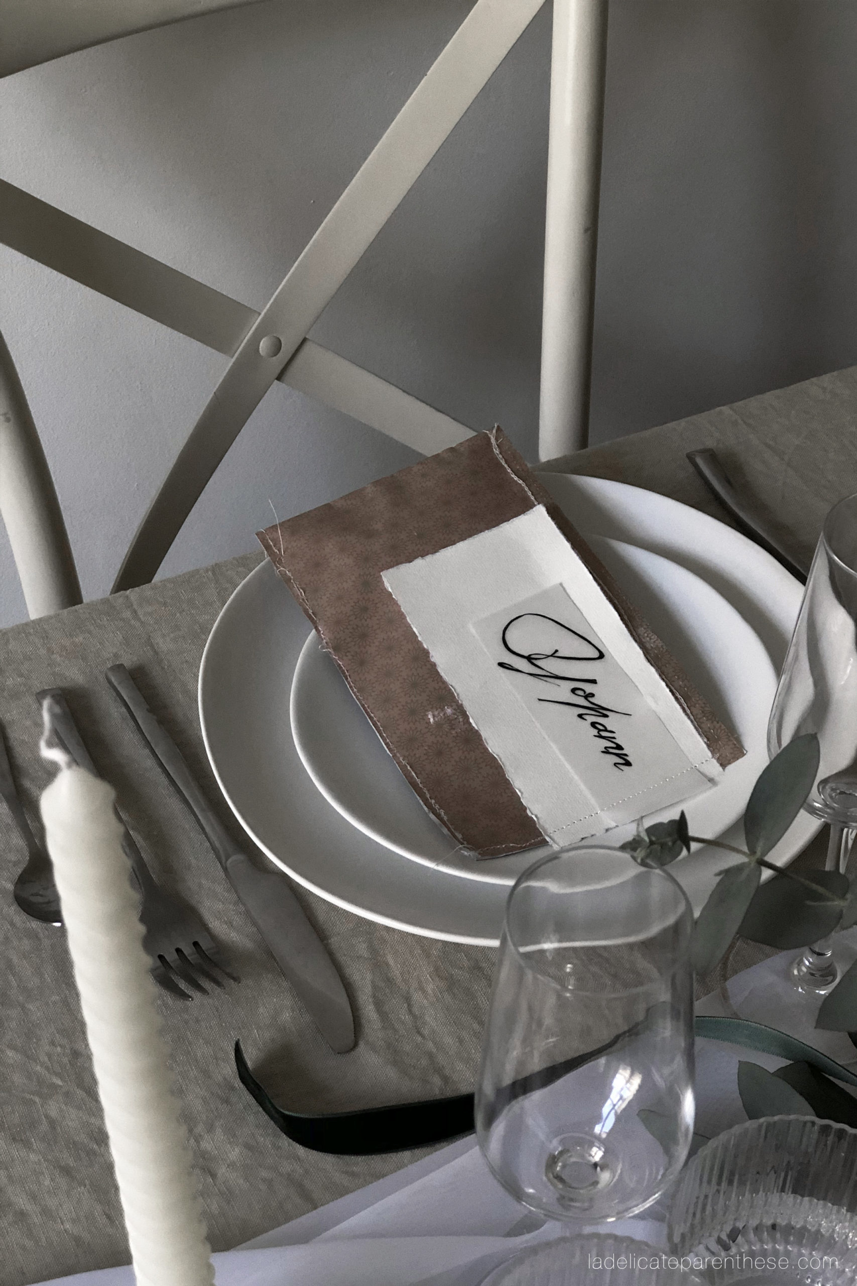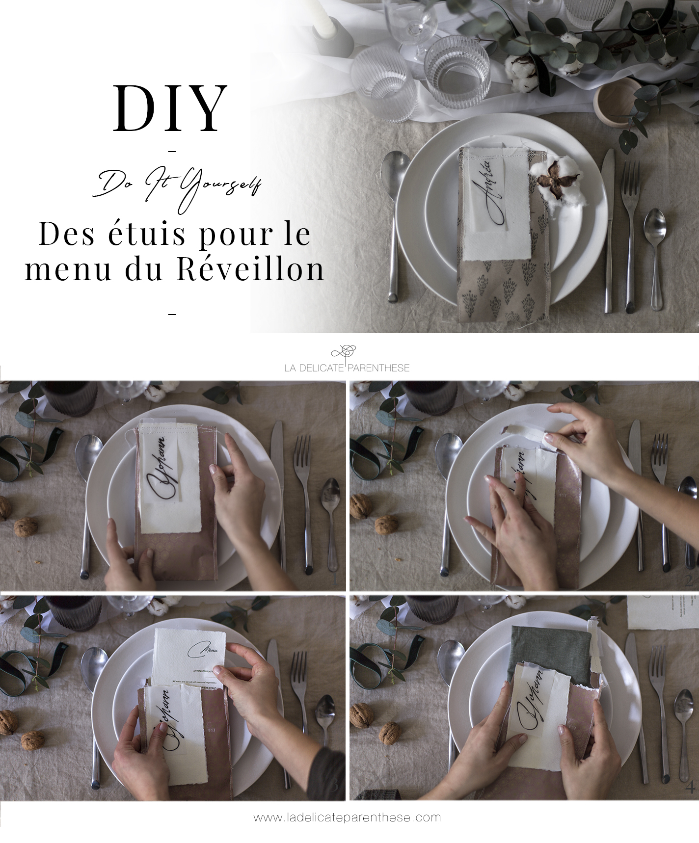 Alors lorsque le papier cadeau s’invite sur la table du réveillon en plus d’emballer les belles attentions, lorsque les quelques chutes de ce dernier sont détournées pour enfermer le menu du dîner ainsi que la serviette d’invité. Cela donne des étuis cousus aussi imparfaits que délicats, laissant à chacun le plaisir de découvrir le menu après avoir ouvert ce dernier.